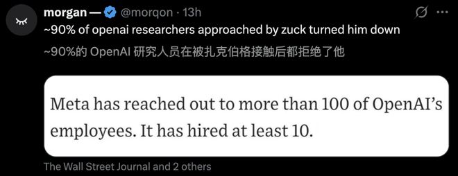 WSJ获得内部消息称,小扎接触了超100名OpenAI员工,也仅招入了10人,90%的人都拒绝了。