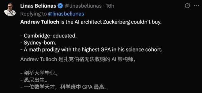 Meta前高管Mike Vernal对Tulloch更是赞不绝口,“他是一位绝对公认的AI天才”。
