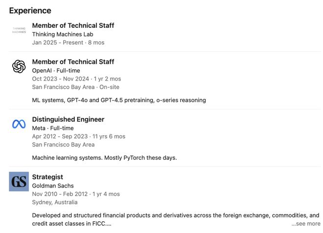 他就是——Andrew Tulloch,现任Thinking Machines Lab联创&首席架构师,曾在Meta干了11年。