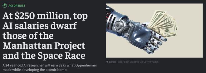 外媒arstechnica给算了一笔账,一名24岁的AI研究员Matt Deitke的2.5亿美元薪酬,将是奥本海默在研发原子弹时期的327倍。