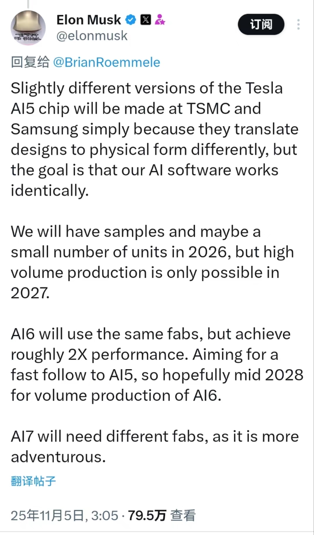 马斯克在社交媒体平台X上回应网友关于“Tesla AI5 芯片”的讨论时,首次披露了该系列芯片的生产计划与后续路线图。