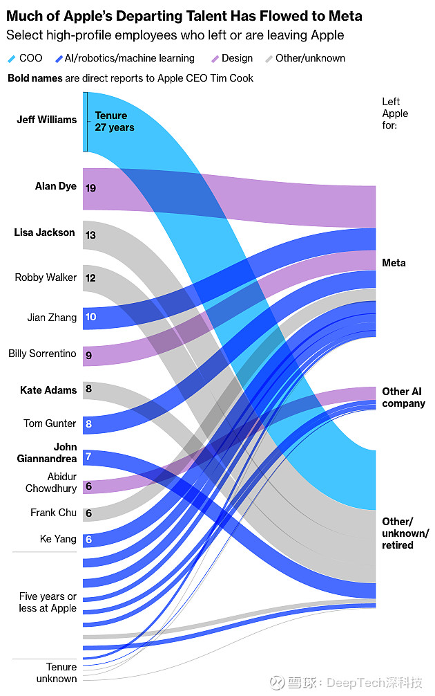 如果说高管层的变动还可以用“退休潮”来解释,毕竟苹果的许多高管都已 60 岁上下,年龄相仿,库克本人也刚过完 65 岁生日,那么 AI 团队的人才流失就完全是另一回事了。